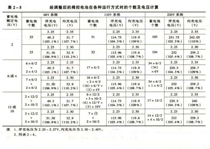 (2)蓄電池的個(gè)數(shù)均少于一般鉛酸蓄電池個(gè)數(shù),對減少安裝與試驗(yàn)工作、減少工程投資都較有利。根據(jù)表2-4,每個(gè)電池浮充電壓按2.25V,均衡充電電壓2.35V計(jì)算。母線電壓有個(gè)別情況要求偏移電壓范圍較大。為此,可將浮充電電壓作少量增減,對均充電壓由2.35V降至2.30V,均充時(shí)間可能略為延長一些。據(jù)一些電池廠試驗(yàn),延長2~3h,即可達(dá)到均衡充電要求。經(jīng)調(diào)整后的電池個(gè)數(shù)與電壓的計(jì)算,見表2-5。