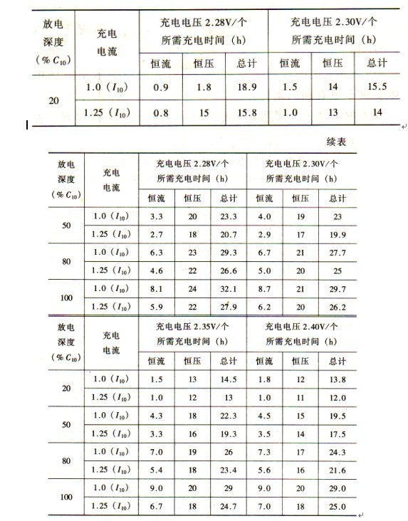 初充電一浮充電一均衡充電是按下列程序循環(huán)進(jìn)行的。在投運(yùn)前,對(duì)電池進(jìn)行初充電,此時(shí)用恒流為l.Oll0進(jìn)行充電。當(dāng)單體電池電壓上升到2.35V轉(zhuǎn)為恒壓充電,此時(shí)充電流逐漸減少,然后轉(zhuǎn)為正常運(yùn)行狀態(tài)即浮充電壓為2.25V。當(dāng)運(yùn)行720h后,進(jìn)行均衡充電,即先以恒流l.Ollo電池充電,至電池電壓為2.35V轉(zhuǎn)為恒壓充電,電壓恒定一段時(shí)間又轉(zhuǎn)為正常浮充狀態(tài)。當(dāng)交流電源中斷后,此時(shí)自動(dòng) 進(jìn)行均衡充電,以恒流l.Ol】o充電。電池電壓上升至2.35V后和上述運(yùn)行初充后均衡充電的過(guò)程相同。上述兩階段充電,其浮充轉(zhuǎn)均充的判斷大多采用時(shí)間來(lái)整定,即不論放電幅度如何,一日由恒流階段轉(zhuǎn)入恒壓階段后,延時(shí)若干個(gè)小時(shí),則自動(dòng)轉(zhuǎn)為浮充。實(shí)際情況是充電所需時(shí)間與放電幅度有關(guān),如圖3-1所示。因此事故放電的深度是隨機(jī)的,若用一個(gè)固定的時(shí)間來(lái)操作,則有可能造成電池的過(guò)充或欠充,所以采用蓄電池回路的充電電流作為均充終期的判據(jù)是較合理的。不同放電深度后充電的所需時(shí)間見(jiàn)表3-1。表3-1 不同放電深度后充電所需時(shí)間