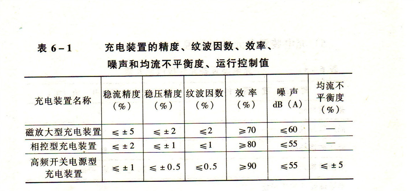 4)充電裝置的精度、紋波因數、效率、噪聲和均流不平衡度、運行控制值,見表6-1.