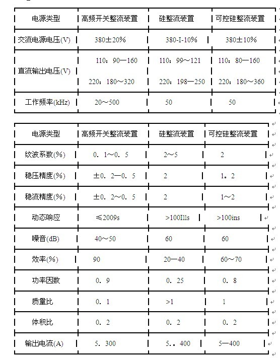 表6-4    高頻開關整流裝置和可控硅、硅整流器充電裝置技術指標比較
